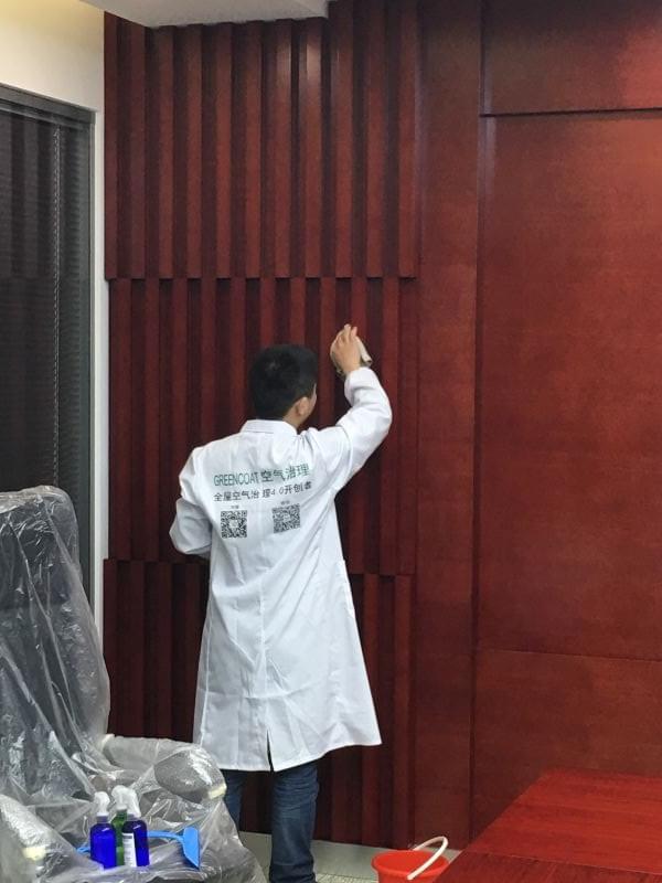 空氣治理員用抹布沾上藥劑細細治理