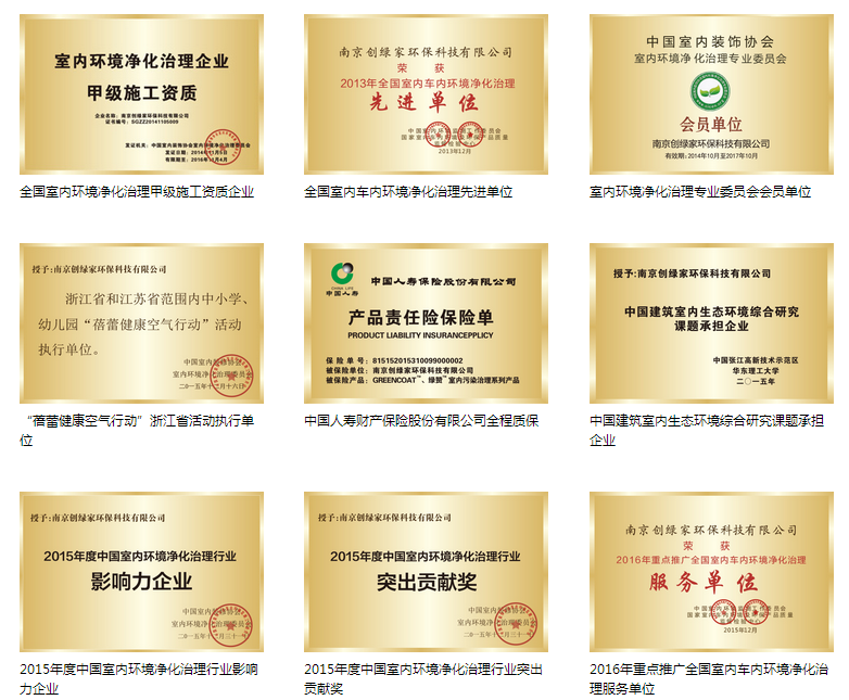 品牌不僅被央視納為宣傳推薦品牌,更是在2012年獲得了中國室內(nèi)環(huán)保凈化產(chǎn)品十佳品牌,同時,創(chuàng)綠家被評為中國中輕質(zhì)量信譽雙保證重點推薦單位,室內(nèi)環(huán)境檢驗治理達(dá)標(biāo)單位,并擁有室內(nèi)環(huán)境污染治理證書,被評為全國環(huán)保行業(yè)質(zhì)量放心、消費者***品牌!